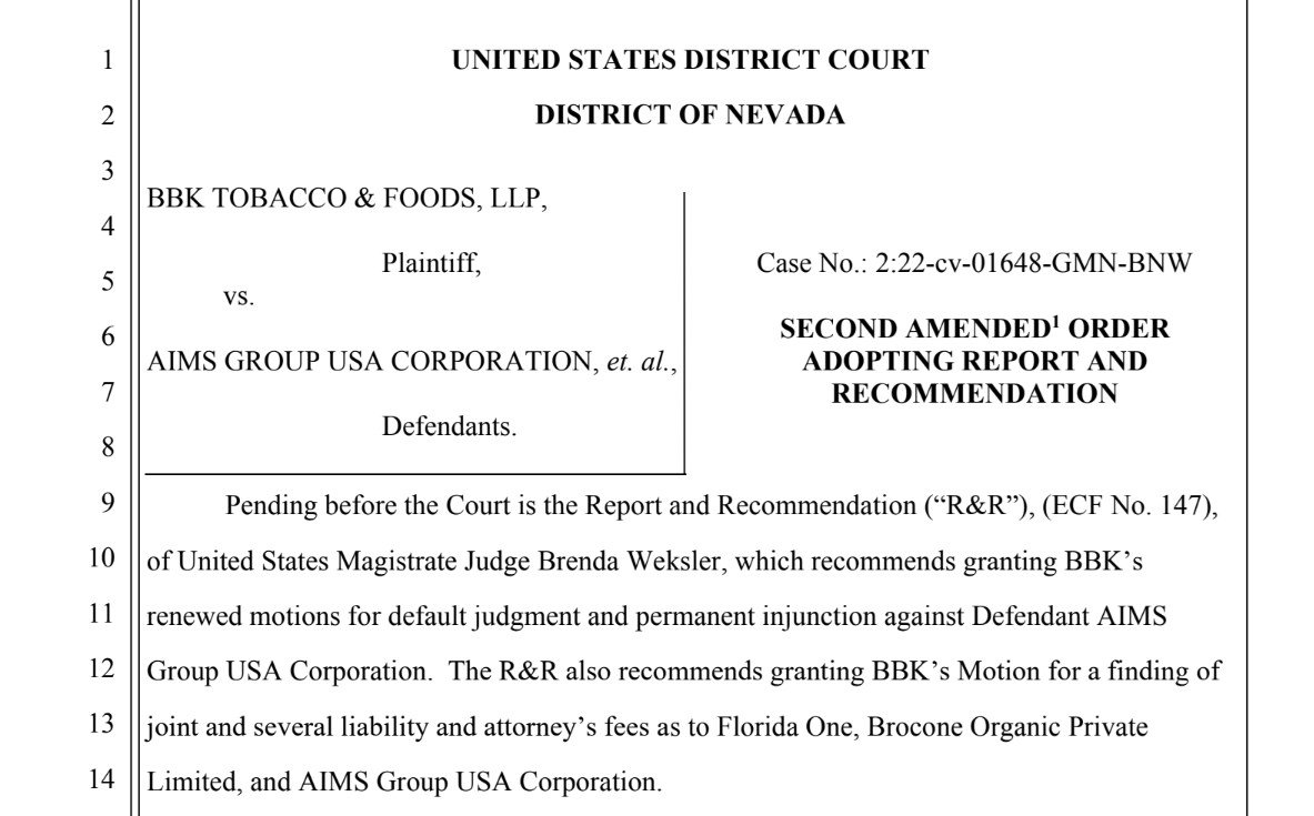 On December 17th, 2024, the United States District Court for the District of Nevada issued its order awarding BBK more than $3 million to reflect disgorgement of the Defendants' wrongful profits and more than $5.6 million in statutory damages for their violation of BBK's copyrights covering its package designs.